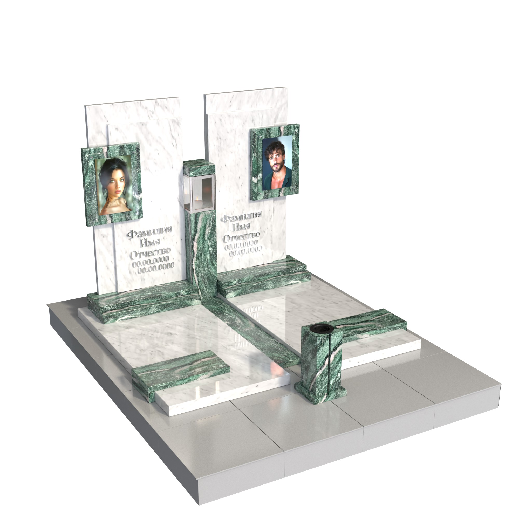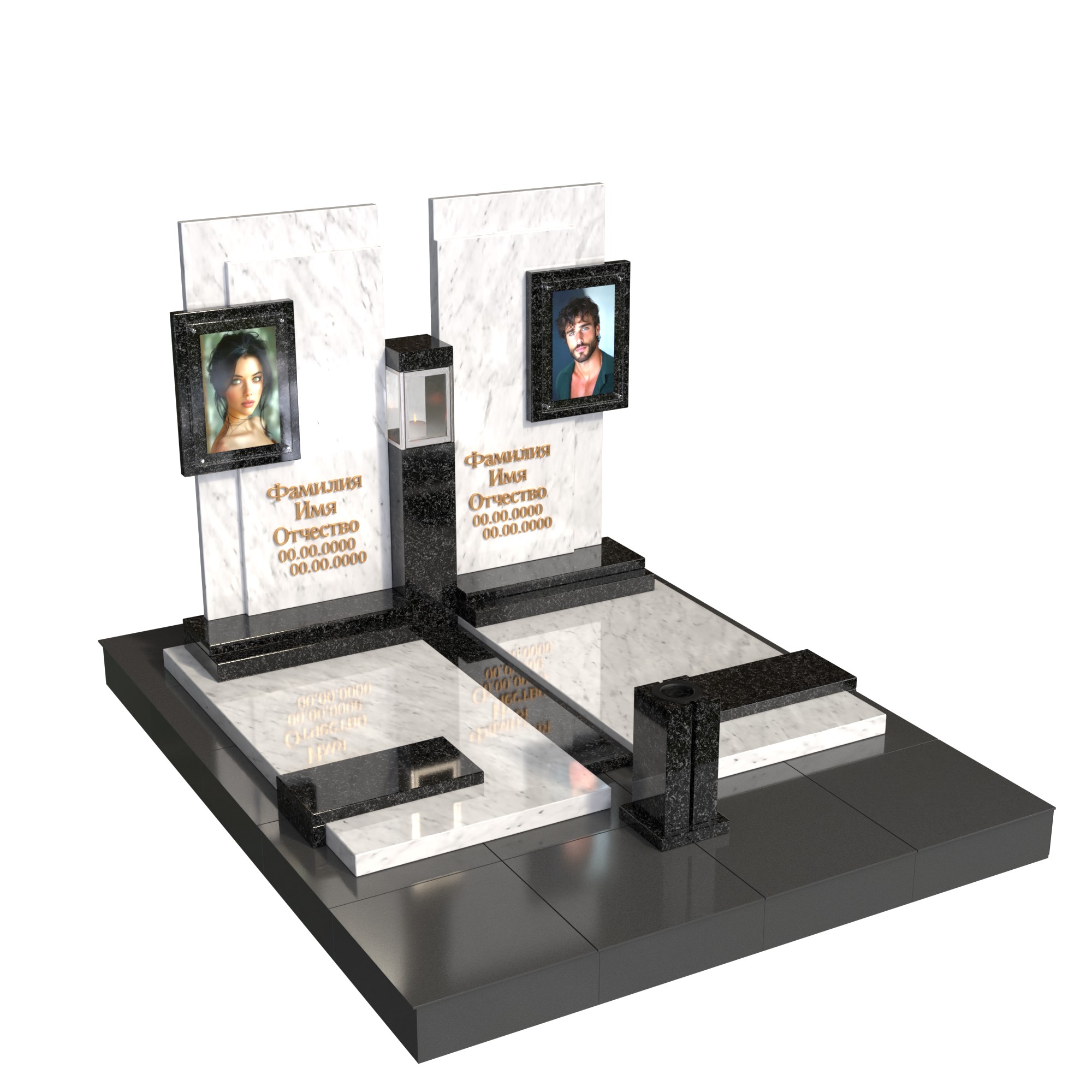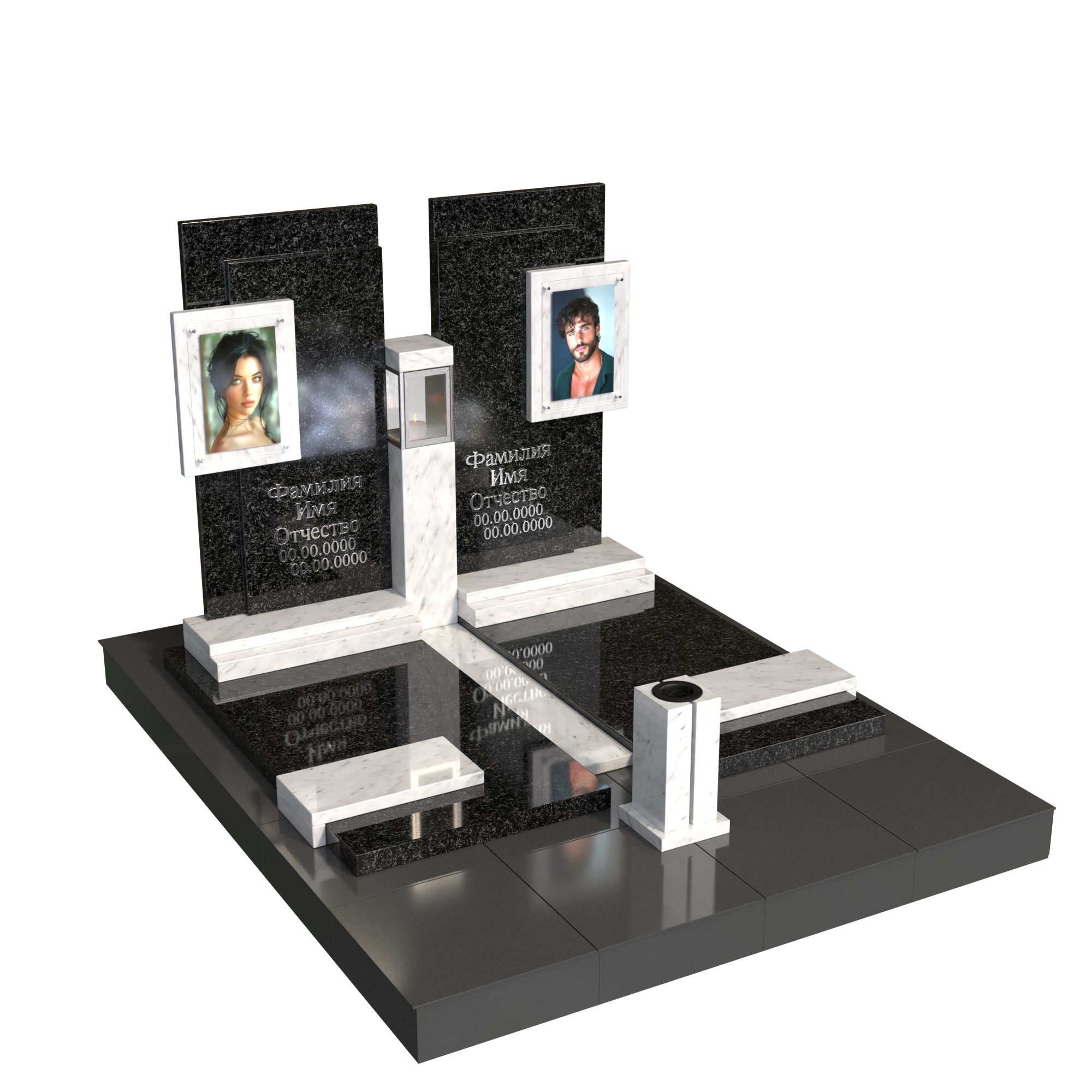 Парный памятник «Единство судеб» — современный мемориальный комплекс для двух захоронений. Две симметричные стелы из натурального камня образуют единую архитектуру, символизируя связь и поддержку на протяжении всей жизни. В каждой стеле — фотопортрет на стекле (крепление на метизах) и индивидуальная гравировка. Центральная лампада и единое основание подчёркивают торжественность и завершённость композиции; предусмотрено место под цветник и аксессуары.