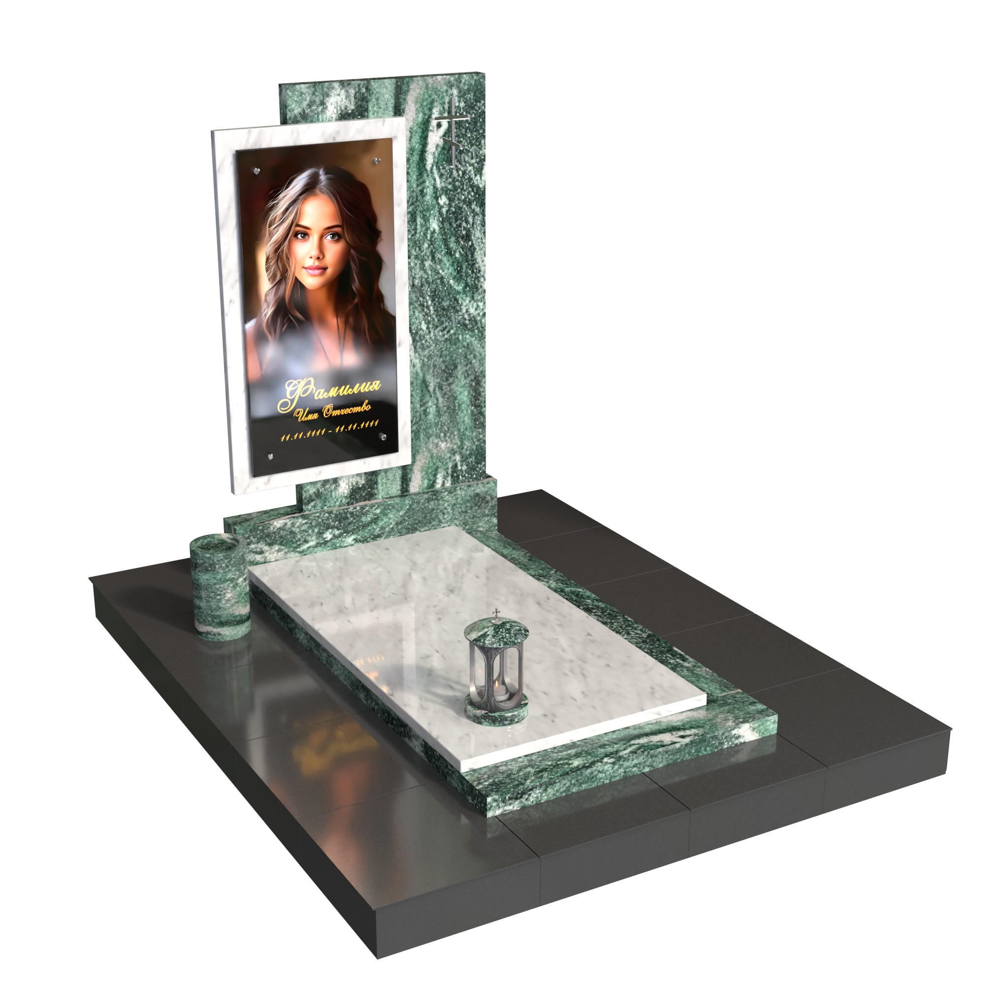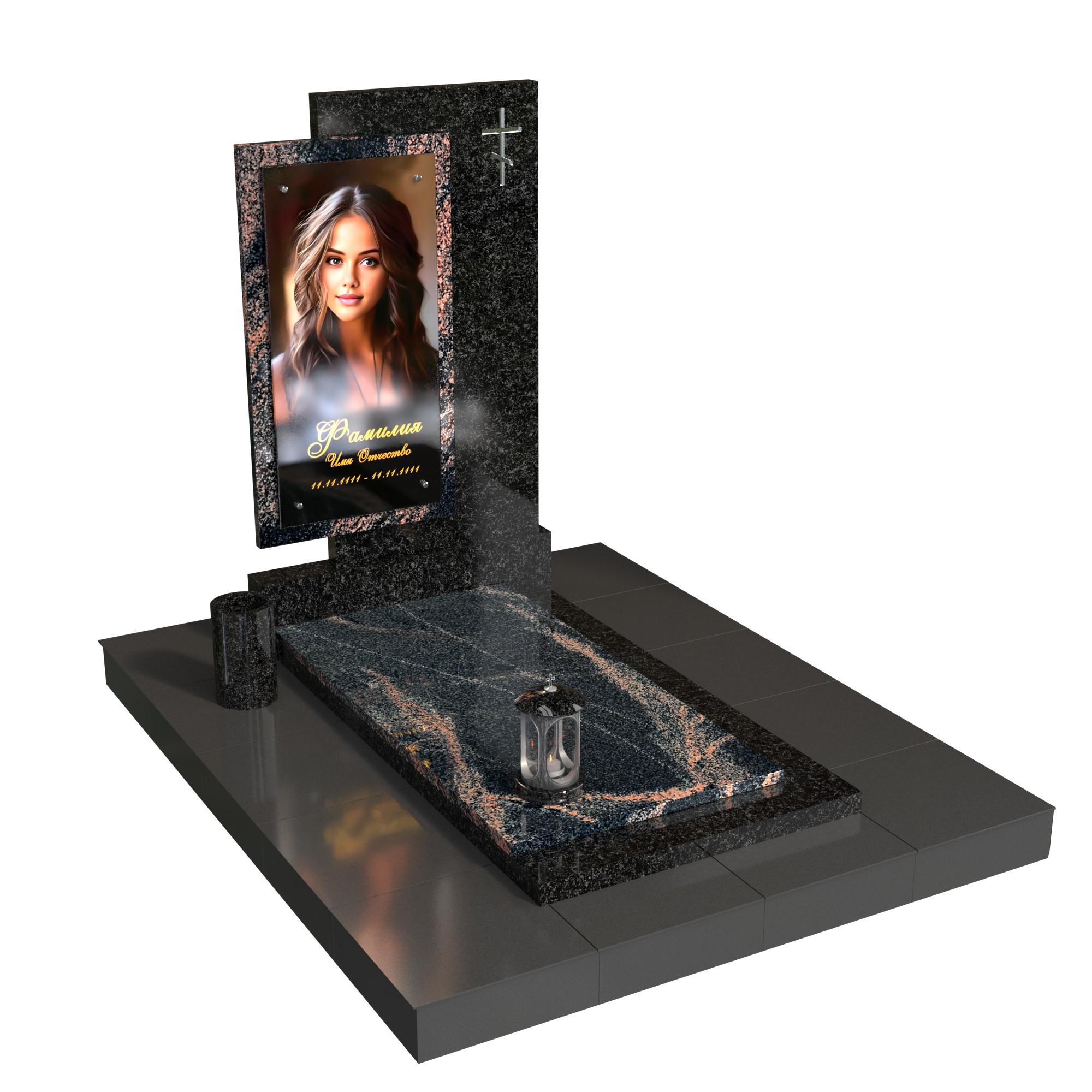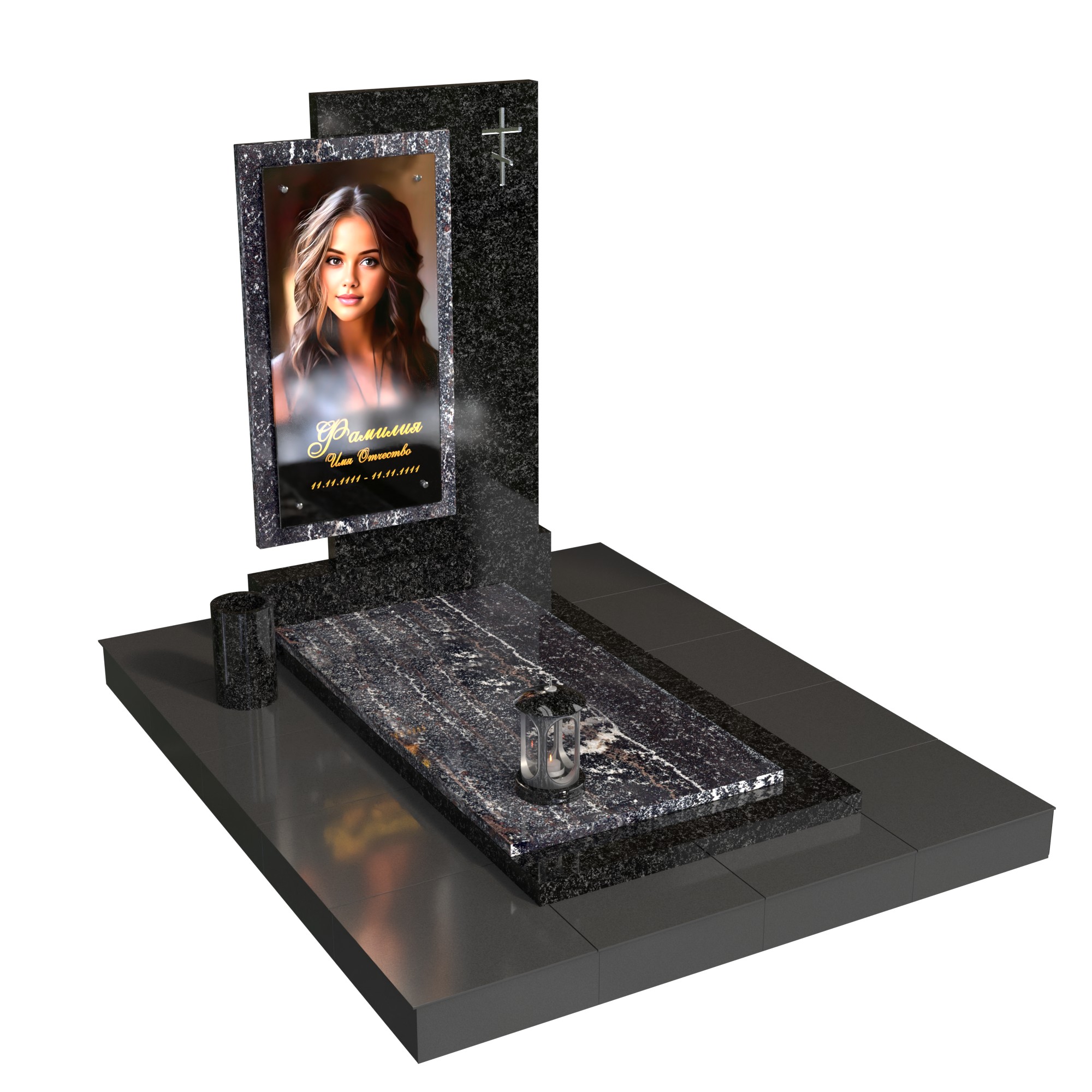 Памятник «Окно памяти» — современная модель из натурального камня с контрастом фактур. Вертикальная стела со стеклянным фотопортретом в декоративной раме (крепление на метизах) и аккуратным крестом создаёт образ достойной, светлой памяти. Двухуровневая плита, цилиндрическая ваза и лампада формируют завершённую композицию и подчёркивают аккуратность благоустройства.