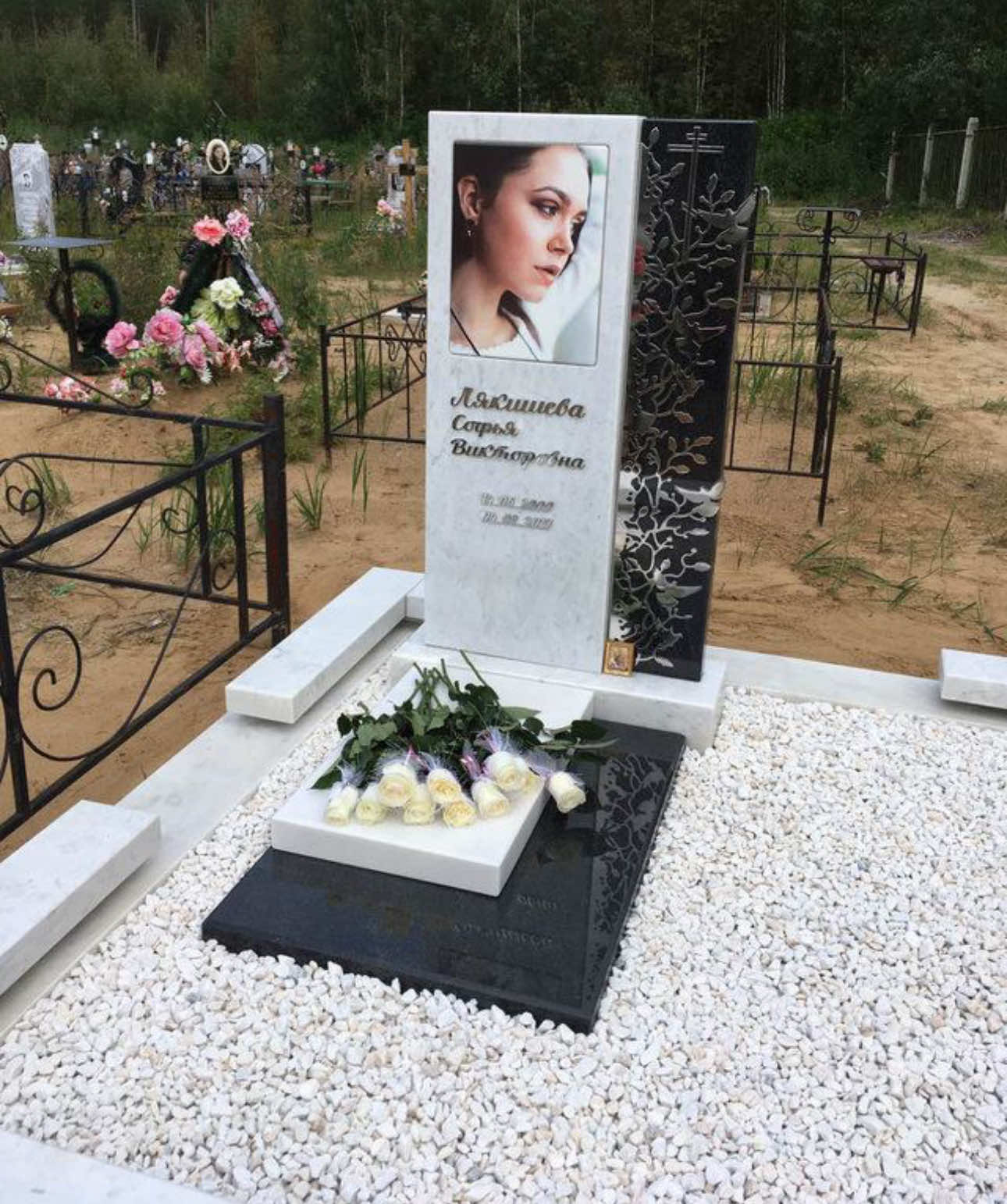 Цветной фотопортрет на стекле, лаконичная гравировка, аккуратная надгробная плита и оформление участка белым мраморным щебнем делают композицию завершённой и выразительной.